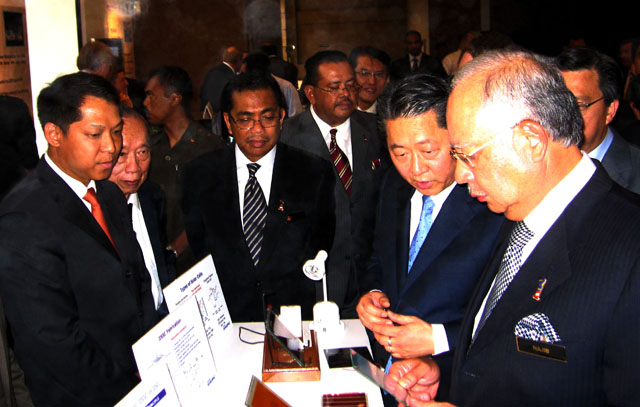 18/4/2011: Visit from the honorable Prime Minister of Malaysia, Dato’ Seri Najib Tun Abdul Razak at Nanopac’s booth during the launch of New Wealth Creation and Ecosystem Initiatives Through Innovation. In the picture: Dr. Lee Tai Kyu (Technical Chairman) briefing the Prime Minister and looking on are Dato’ Dr. Cheng Kok Leong (CEO) and Tan Sri Yuen Yuet Leng (Chairman).