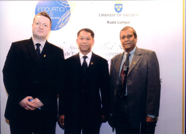 6/5/2011: NANOPAC’s CEO, Dato’ Dr. Cheng Kok Leong (middle) in the Sweden Malaysia Nobel Gala Dinner at Hilton Hotel, KL. Dato’ Dr. Cheng was one of the invited innovation forum speakers of the Sweden Malaysia Innovation Days 2011. In the picture: (left) Mr. Bass Melssen (Exec. Vice President, UNIK) and Dr. Taufiq Thiagi (Advisor, UNIK).
