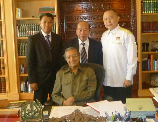 1/4/2012: A courtesy visit to former Prime Minister of Malaysia, Tun Dr. Mahathir Mohamad at the Perdana Leadership Foundation, Putrajaya. Standing behind the former premier (from the left): Dato’ Dr. Cheng Kok Leong (CEO, Nanopac), Tan Sri Yuen Yuet Leng (Chairman, Nanopac) and Mr. Lee Yew Meng (Advisor, UNIK).