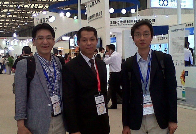 17/5/2012: A visit to the 6th SNEC PV Power Expo 2012 at Shanghai, China. In the picture (from the left): Mr Heo, Dato’ Dr. Cheng Kok Leong (CEO, Nanopac) and Mr. Yoon (R&D Director, Nanopac).