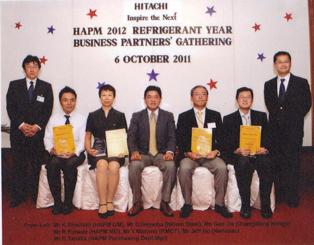 6/10/2011: NANOPAC received 2011 Refrigerant Year Business Partners’ Award from Hitachi Air Conditioning Products (HAPM).