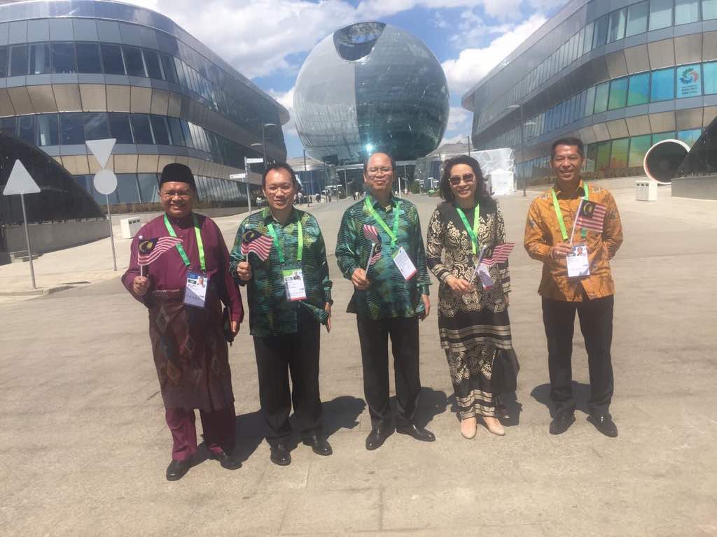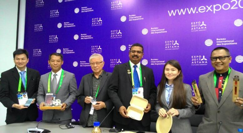 25/6/2017: Malaysian VIP delegation to Astana Expo 2017, Kazakhstan. From left: project director from Bioeconomy Mr Zainal Azman Abu Kasim, KETTHA TKSU Dato’ Dr. Tan Yew Chong, MOSTI Minister YB Datuk Seri Panglima Wilfred Madius Tangau and spouse, and Nanopac CEO Dato’ Dr. Cheng.